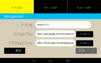上記の「アプリGET」機能の他、「ポイントGET」や「ICカードSET」があります。これら機能は、指定のCRMシステムとの連携が可能になります。CRMシステム運営者より発行されたAPIキーを入力して認証を完了させます。ユーザー画面側で携帯電話番号を入力、SMSを受け取ることで簡単に会員登録やポイント付与(確認)ができるようになります。