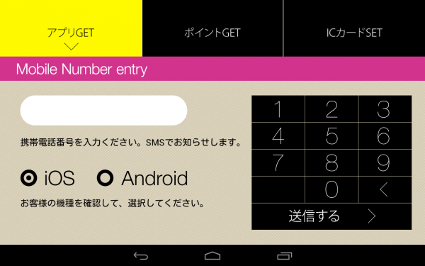 携帯電話番号宛にメッセージを送ることができるSMS(ショートメッセーシ゛サーヒ゛ス)を活用して、スマホアプリのインストール促進を実現するアプリです。基本、タブレットサイズのスマートデバイスでの利用となります。店頭や会場で、お客様にタブレットをお渡しして、お客様自身が自分の携帯電話番号を入力送信することで、誘導したいページのURLをSMS内に入れて、送ります。お客様は、自分の携帯・スマホに届いたSMSを見て原稿内にあるURLをタップするだけで、目的のページに簡単にアクセスできます。