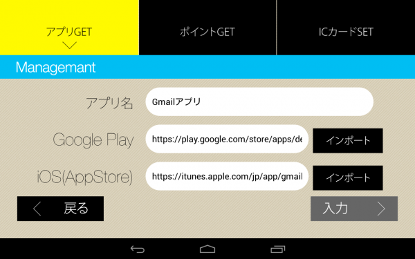 [URL] https://play.google.com/store/apps/details?id=jp.co.media4u.smsforce「店頭SMS」アプリは、〈管理者側〉と〈ユーザー側〉とに大きく分かれております。初回起動時は、管理側から立ち上がります。最初に認証コードを決めて、アクティベーションさせます。※認証コードは何桁でもかまいませんが、忘れないようにメモをしておいてください。設定変更時に必要になります。