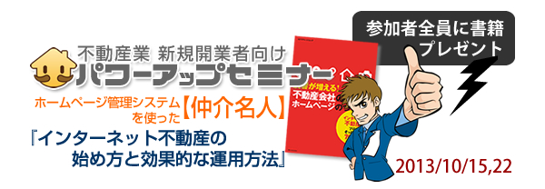 不動産専門ホームページ制作サービス【仲介名人】は、新規開業を検討されている方向けに無料セミナーを開催します。今回は2013年10月15日(火)と22日(火)の2回を予定しています。インターネット不動産を始める前に知っておきたいインターネット最新事情、SEO対策、ホームページ管理システム【仲介名人】を使って開業に成功している事例などをわかりやすくご紹介します。参加者にはもれなく書籍『反響が増える!不動産会社のためのホームページの作り方(発行元:株式会社エクスナレッジ・販売部/ 定価:1,680円)』をプレゼント!席に限りがございますのでお早めにお申込みください。