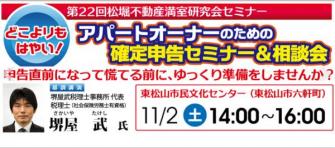 (株)松堀不動産(埼玉県東松山市 代表取締役堀越 重男)は11月2日14時より第22回の満室研究会セミナーを埼玉県東松山市「東松山市民文化センター」にて「どこよりもはやい アパートオーナーのための確定申告セミナー&相談会」を開催致します。