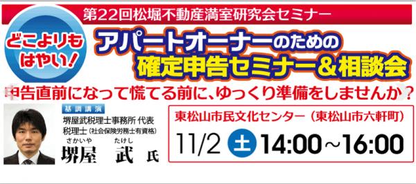 (株)松堀不動産(埼玉県東松山市 代表取締役堀越 重男)は11月2日14時より第22回の満室研究会セミナーを埼玉県東松山市「東松山市民文化センター」にて「どこよりもはやい アパートオーナーのための確定申告セミナー&相談会」を開催致します。