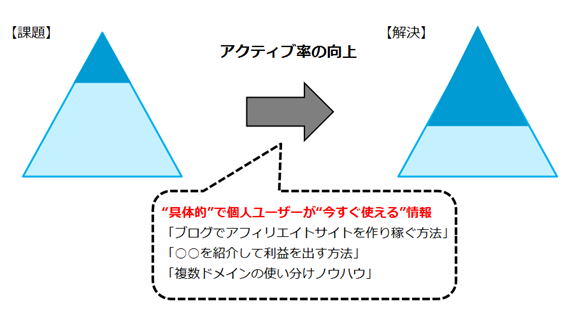 アフィリエイターのアクティブユーザーを増やすために、”具体的”かつ”今すぐ使える”情報をユーザーに提供することで、これらの問題を解決するともしもは考えています。
