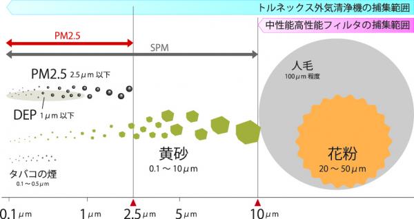 1μm=1/1,000mm PM2.5=2.5μm以下の粒子状物質。