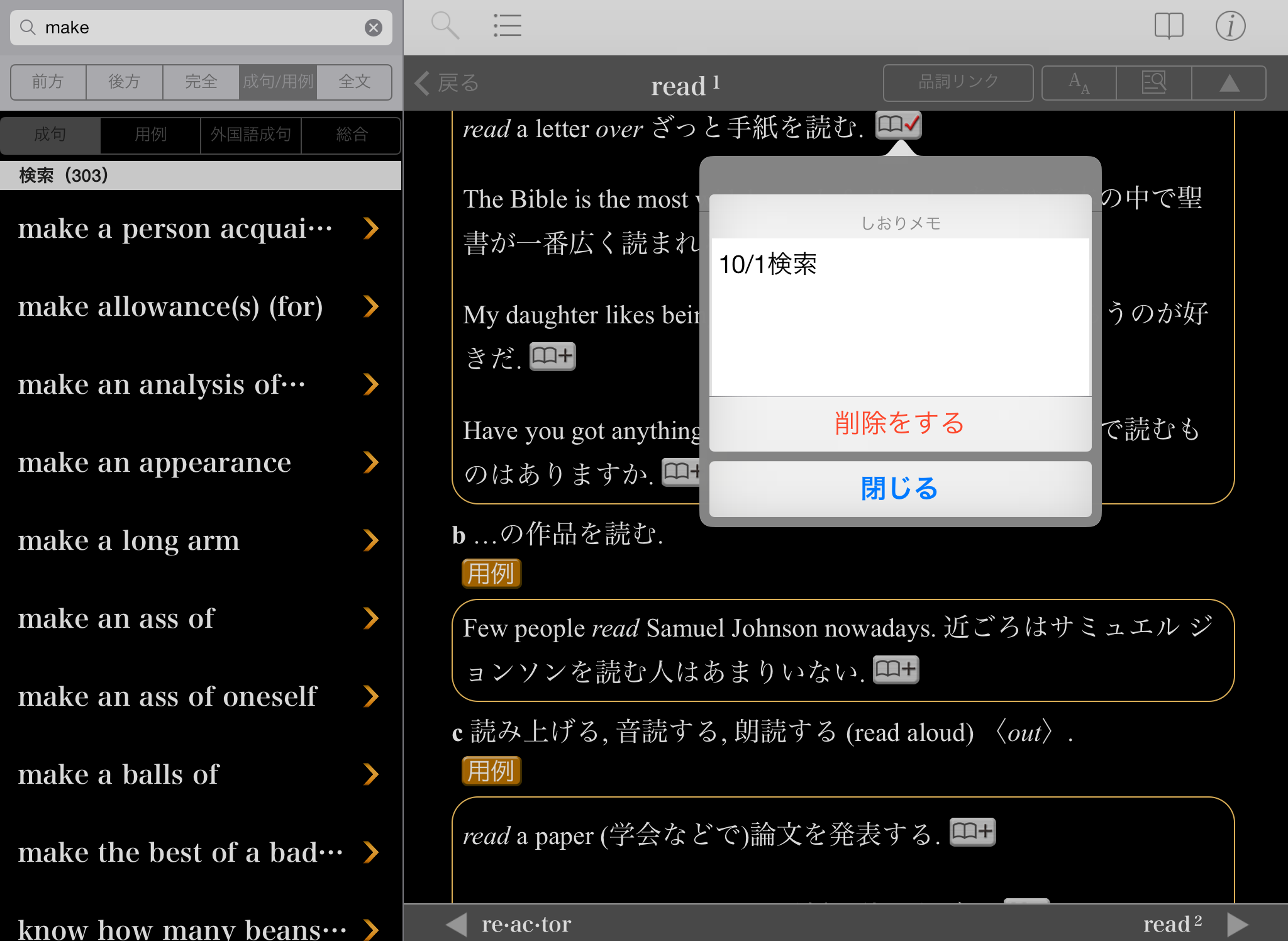 ●連続する辞書引きに役立つ履歴表示(閲覧日も表示)、しおり(メモ機能付き)、検索キーワード履歴など。