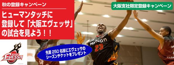 キャンペーン期間内に、ヒューマンタッチの大阪支社へ来社登録頂いた方を対象として、大阪エヴェッサのホームゲーム観戦チケットを先着250名様(500枚)にペアでプレゼント。