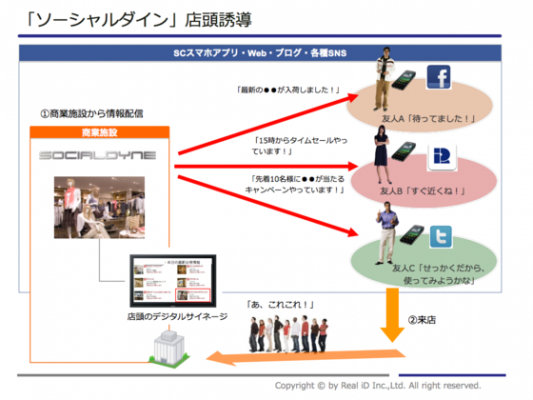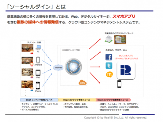 株式会社Real iD(本社:東京都新宿区、代表取締役社長:鈴木宏一)は2013年10月上旬より、商業施設むけテナント投稿システム「Social Dyne」(以下ソーシャルダイン)を都内オフィスビル内レストランフロアに導入、運用を開始しました。