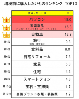 増税前は購入者が増えると言われている住宅や自動車を抜いて、第1位に輝いたのは、「パソコン」18.0%でした。どうやら「WindowsXP」のサポート終了が2014年4月9日で、消費税増税のタイミングと重なったことが、購入の後押しとなっているようです。