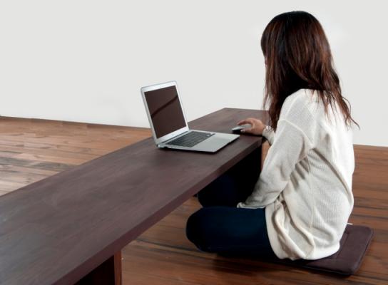 現代におけるそれはまさにそこでPC等の作業がしやすいデスクのこと。本来は床に座って文を綴るための机、それを現代に昇華させ、「床に座る」とう動作のみを受け継いで具現化させたものです。デスクとして必要なものはその天板であり、そこに必要かつ最小限のスペースがあれば事足ります。その天板だけが床面から浮いてるように見せようとした文机(ローテーブル・座卓)です。