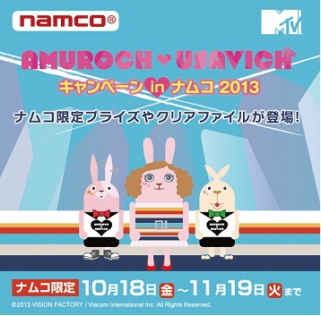 株式会社ナムコ(東京都大田区)は、昨年に引き続き、「AMUROCH×USAVICH」(アムロッチ×ウサビッチ)の景品を発売するフリュー株式会社とのタイアップ企画「AMUROCH×USAVICH キャンペーンin ナムコ 2013」を、10月18日(金)から全国の直営アミューズメント施設 94店舗で開催します。