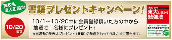 株式会社シンドバッド・インターナショナル(東京都渋谷区)は、同社が運営する会員制eラーニングサービス『スタディ・タウン高校生』に、2013年10月1日から10月20日会員登録した方から抽選で1名に、書籍『部活しながら東大に受かる勉強法(浜田一志著・中経出版) 』をプレゼントするキャンペーンを実施する。(尚、当選者の発表はプレゼントの発送を持って代えるものとする)