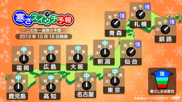 『寒さスイッチ予報』とは・・・この先一週間は寒く感じるのかどうか、一日の気温だけではなく、風や湿度、前日や平年との気温差などを考慮したLBW独自のアルゴリズムをもとに発表している予報で、秋から冬にかけての皆様の生活を強力サポートします。
