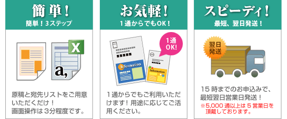 原稿ファイルと宛先ファイルをご用意いただくだけで1通から最短翌営業日発送が可能です。