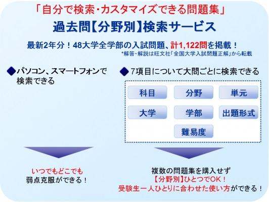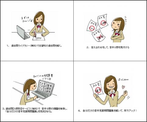 「いつでも」「どこでも」「自分でカスタマイズできるWeb問題集」として、受験生に新たな勉強スタイルを提供できる。それが「過去問【分野別】サービス」です。