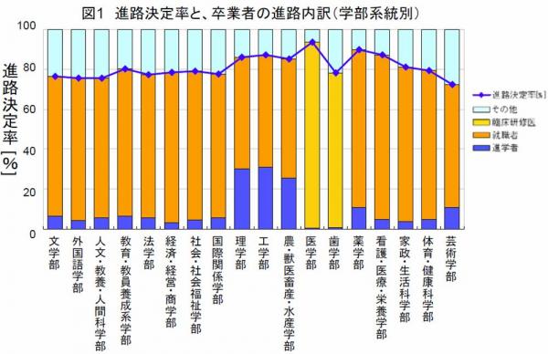・国立大学は進学率の高い理系学部(理・工・農・薬)の人数が多い(49.7%) 。これらの学部は進路決定率が高く、国立大学全体の進路決定率を押し上げている。