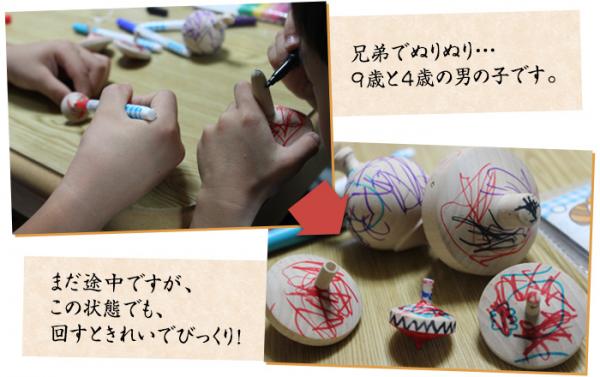 色は、赤、黄、緑、紫、黒、無塗装の6色をご用意しました。無塗装の独楽には、お子さんがクレヨンやマジックなどで自分の好きな色を塗って遊べます。