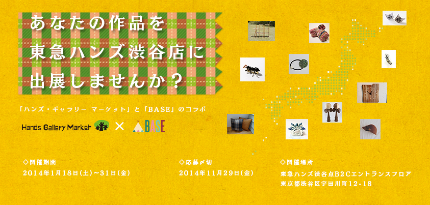 2013年10月18日(金)、BASE株式会社(代表:鶴岡裕太/東京都港区)は同社が運営するネットショップを無料で作ることができるサービスである「BASE」と、株式会社東急ハンズ(代表:榊 真二/東京都渋谷区)が運営する「ハンズ・ギャラリー マーケット」は共同で地方のクリエイターを支援するイベントを開催いたします。今回のイベントは「日本全国のクリエイターの手づくり作品が渋谷に集合!」と言ったコンセプトで手づくりの作品をオンラインで販売される方向けに企画されたもので、BASE、ハンズ・ギャラリー マーケットがそれぞれ公開している専用の募集ページからイベント参加の申し込みを行うことができます。申し込みを行った方から抽選で選ばれた40名前後のクリエイターが東急ハンズ渋谷店で開催されるイベントで実際に自分の商品を販売することができます。