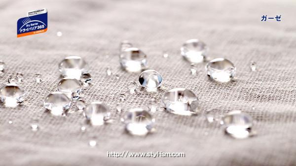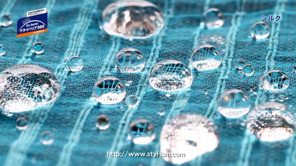「ドライバリア365」は、水や油などに表面張力作用を働かせる事により、ガーゼやレース生地でも「濡れない」「染みない」という常識を覆すような現象を起こします。