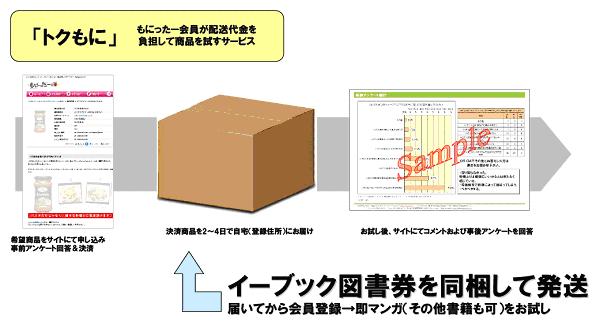 今回のキャンペーンは、「もにったー」内のサービスである、消費者がお届けに関する配送費の負担だけで希望の商品が試せる「トクもに」の10月度申込者を対象に、eBookJapanの電子書籍を購入できる「eBook図書券(525円分)」を商品に同梱してお届けする内容となっております。