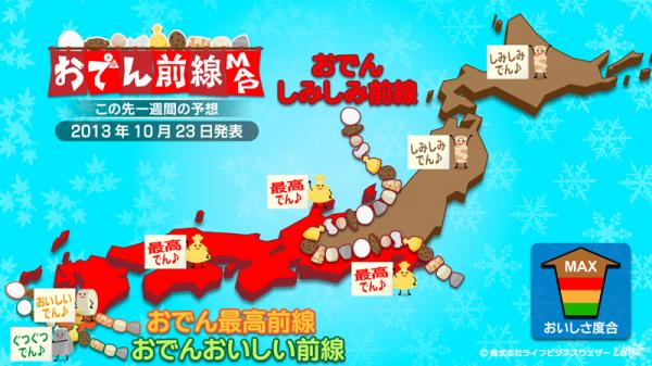 『おでん前線』とは・・・体感気温などの要素からLBW独自のアルゴリズムから導きだした「おでんの食べ頃」を伝える予報。「食べるなら今でしょ!」というタイミングがわかります。