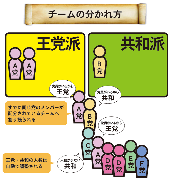 (例)党の最初の参加者が王党派に振り分けられた場合、その党の参加者は全員王党派になる)