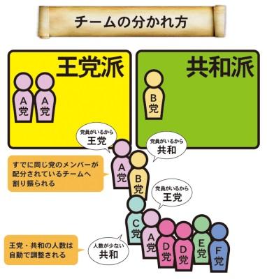 (例)党の最初の参加者が王党派に振り分けられた場合、その党の参加者は全員王党派になる)