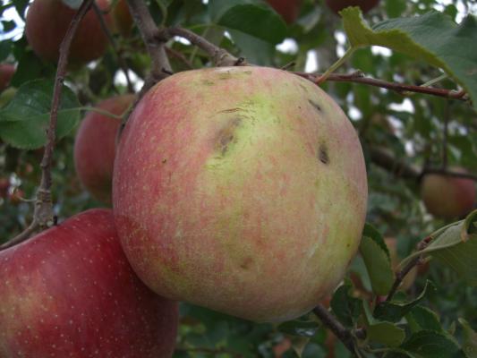 ▲写真: 台風26号の影響で表面が傷ついたリンゴ(長野県下伊那郡松川町で撮影)