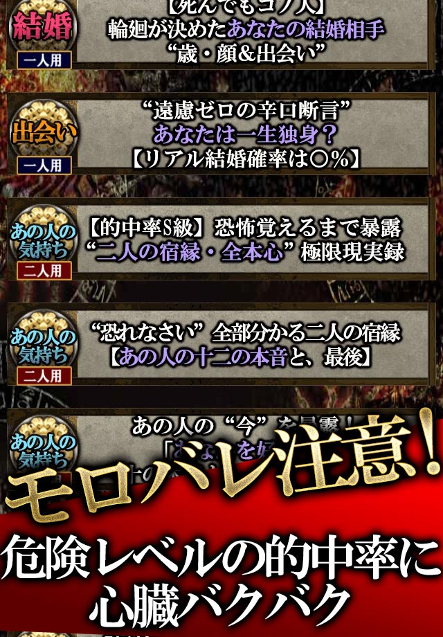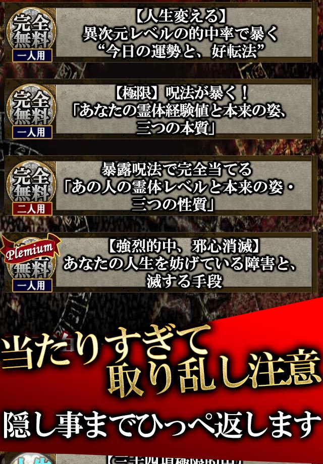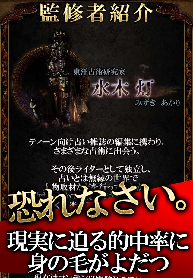 ・アプリ名称:恐怖的中◆チベット呪術占い「滅心救命経」水木灯