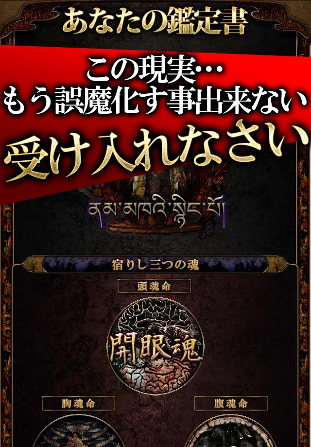 異次元レベルの的中力と、禁断の暴露呪法で闇を滅し、あなたの人生を蘇らせます。人は時々間違いを起こします。煩悩に動かされ、苦しみを覚えます。チベットの法典を開き、正しい道を明らかにすることであなたを苦しみから救い出します。