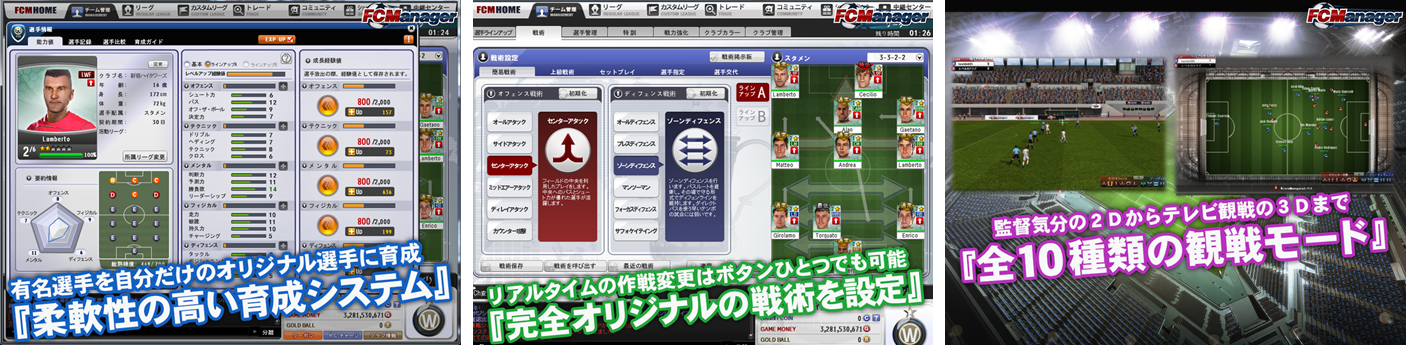 『FCマネージャー』は育成シミュレーションゲームです。試合中、選手たちはキミの出した戦術を元に、その時の状況に応じた選択をしてアクションします。設定しておけば、仕事中でも、勉強中でも、家事をしていても、別のゲームで遊んでいる間も、自動で試合を戦ってくれます。