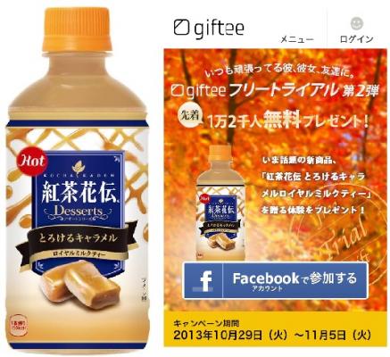 【利用概要】 いつも頑張っている彼、彼女、友達にいま話題の新商品「紅茶花伝 とろけるキャラメルロイヤルミルクティー」を贈る体験を先着1万2千名様にプレゼント。