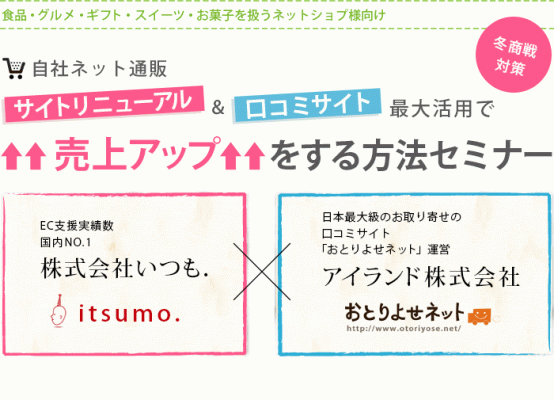 株式会社いつも. (本社:東京都港区、代表取締役社長:坂本守、以下 いつも.)が、日本最大級のお取り寄せの口コミサイト「おとりよせネット」運営アイランド株式会社様との合同セミナー『サイトリニューアル&口コミサイト最大活用で売上アップをする方法セミナー』を東京・福岡にて参加費無料で開催いたします。