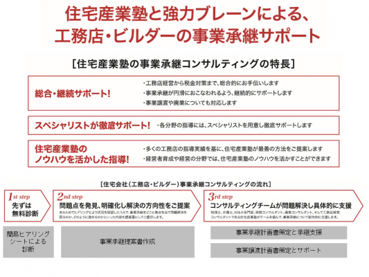 ただ工務店・ビルダーの中には、事業承継で悩みを抱えている方が多くおられます。事業承継をうまく乗り切れず会社の存続に影響が出てしまっては、社員や職人、そしてお客様にも大きな影響を及ぼしてしまいます。そこで工務店・ビルダーの事業承継が円滑に進むよう、住宅産業塾と各分野の専門家が“事業承継コンサルティングチーム”を作り、事業承継全体をバックアップできる体制を整えました。