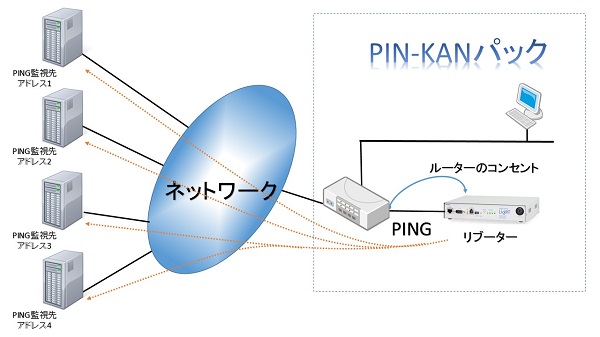 「PIN-KAN」パックは明京電機株式会社の製品である「リブーター」(ネットワーク電源制御装置)に、4つのPING監視先アドレスと1つのE-mailアドレスを加えたパッケージ商品である。リブーターに安定した4つのPING監視先アドレスがセットされることで、ルーターのフリーズが正確に、かつ、すばやく検出され、電源再起動によるフリーズの自動解消が行なわれる。