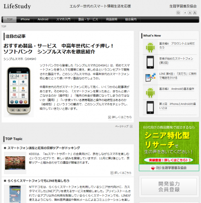 生涯学習普及協会は、2013年11月8日(金)より、シニア層に特化したスマートフォンやネットなどの情報&活用サイト「LifeStudy(http://lifestudy.jp)」をスタートします。シニア層が迷うスマートフォンの選び方、購入後の使い方、シニア世代の購入体験談、シニア向け新製品・サービスの情報を網羅した専門サイトです。協会のシニア世代会員250名(50~80代)のスマートフォンやネットに対する要望や疑問をテーマに編集される、国内初の「シニアの声から生まれた専門サイト」です。