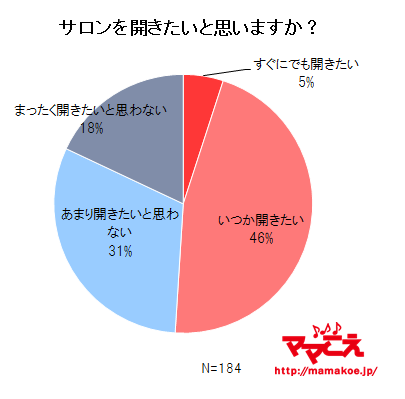 ママたちに、「サロンを開きたいと思いますか?」と聞いたところ、「すぐにでも開きたい」(5 %)、「いつか開きたい」(46%)と答えたママが過半数に達し、サロンへの興味・関心の高さがうかがえました。