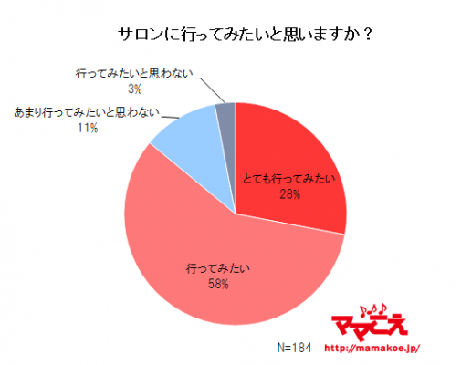 では、誰かが開いたサロンに参加してみたいと思うママはどれくらいいるでしょうか。「サロンに行ってみたいと思いますか?」と聞いたところ、「とても行ってみたい」(28%)、「行ってみたい」(58%)と、9割近くのママが参加意欲を示しました。