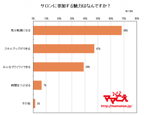 「サロンに参加する魅力はなんですか?」という質問では、「気分転換になる」(68%)と答えたママが断トツ。「スキルアップになる」(47%)、「みんなでワイワイできる」(39%)がそれに続きます。
