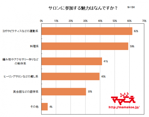 「どんなサロンなら参加したいと思いますか?」という質問をしたところ、「ヨガやピラティスなどの運動系」(62%)と、「料理系」(59%)の2つに人気が集中しました。前項にあった“気分転換”がしやすい内容であることも一因と考えられます。