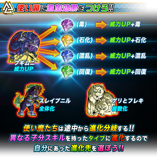 進化素材の宝石は「毒」「石化」「混乱」「回復」があります。 フギムニは「威力UP」、スレイプニルは「全体化」、ゲリとフレキは