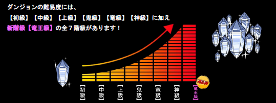 ダンジョンの難易度には、【初級】【中級】【上級】【鬼級】【竜級】【神級】に加え、新階級【竜王級】の全7階級があります!