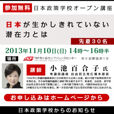 小池氏の考える解決への切り札、それは「もったいない力」の活用です。例えば「女性力」。出産・育児の環境を整備することによって、女性の活躍の場を広げ、成長戦略につなげる。「環境力」を活かし、グリーンカラーの雇用を増強、環境技術を成長産業に育てる。家族や地域の絆を強化し、コミュニティとしての結束力を高める「地域力」。新しい力、外からの変化に頼るのではなく、埋もれてしまっている価値ある力を呼び覚ますことこそが、厳しい現状を打破する鍵であると小池氏は主張しています。
