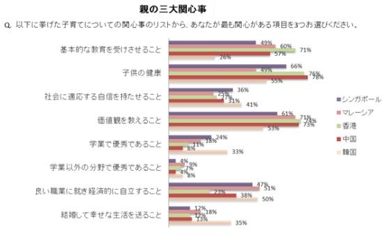 調査対象国の中で韓国だけが異なる傾向を見せた。韓国の親は、子供に基本的な教育を受けさせること(26%)よりも、子供がよい仕事について経済的に独立すること(50%)に関心が高いという結果であった。