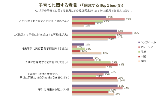 子供を育てる場所に関しての質問では、マレーシアの親の意見が際立っており、75%が「マレーシアは子供を育てるのに良い場所である」と回答した。それに対し韓国では「韓国は子供を育てるのに良い場所である」と考えている親はわずか17%であった。