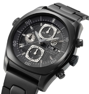 文字盤上には、曜日と日付を示すディスプレイが3時側に、中央にはスクエア型のクロノグラフが、そして12時側と6時側には分針、時針のカウンターが配置されています。ルミノックスすべての時計に搭載されている自己発光システムルミノックス・ライト・テクノロジー(LLT)も搭載。色はオールブラックで仕上げており、ルミノックスでも定評のブラックアウトということで2色でまとめブラックを強調してあります。