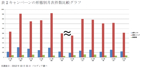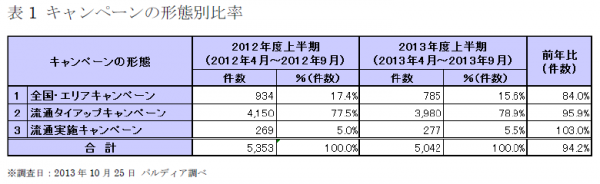 2013年度上半期を対象とした調査結果(表1参照)ではキャンペーンの総件数は5,042件であり、2012年度上半期の総件数5,353件から約94%に減少しました。