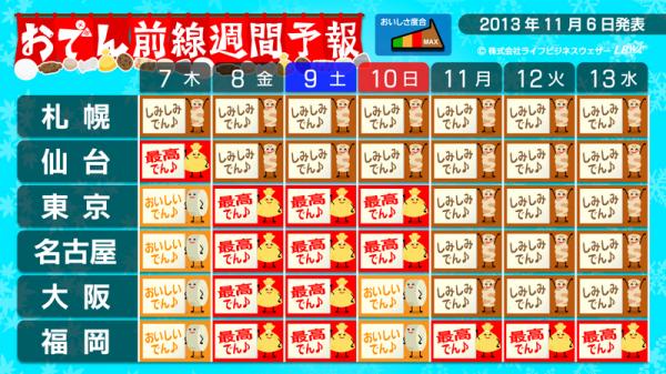 『おでん前線』とは・・・体感気温などの要素からLBW独自のアルゴリズムから導きだした「おでんの食べ頃」を伝える予報。「食べるなら今でしょ!」というタイミングがわかります。