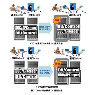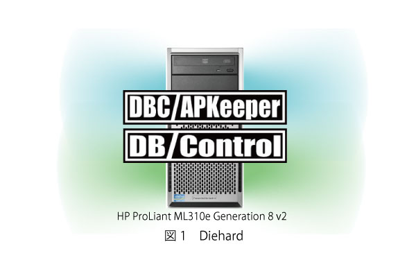 Diehardは、日本HP社製の汎用PCサーバにデータアクセス株式会社(代表取締役:香西省治、本社:豊島区東池袋1-47-3、以下データアクセス社)開発の高可用性を実現するミドルウェアDB/ControlとDBC/APKeeperをプレインストールし、専門知識、高額な初期投資や維持費なしで高可用性を実現するアプライアンスです(図1)。お客様のサービスの規模や内容に応じたDiehardを、電源ONで即、利用可能な状態でお客様にお届けします。