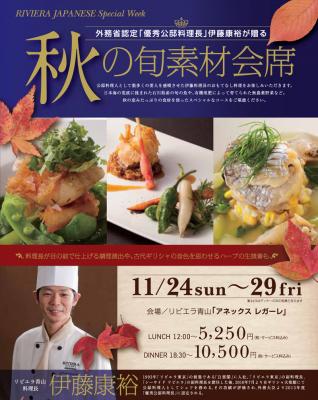 株式会社リビエラ東京は、外務省認定「優秀公邸料理長」伊藤康裕が贈る、秋の旬素材会席を開催します。 日本海の荒波に揉まれた石川県産の旬の魚や、有機堆肥によって育てられた無農薬野菜など。 秋の恵みたっぷりの食材を使ったスペシャルなコースをご堪能ください。料理長が目の前で仕上げる調理演出や、古代ギリシャの音色を思わせるハープの生演奏も予定しております。