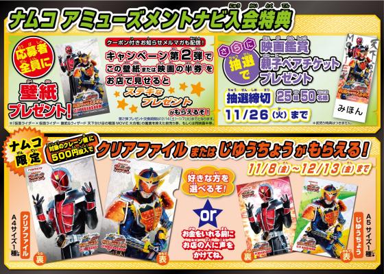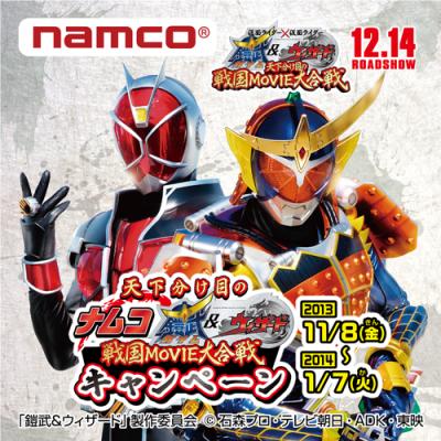 全国のナムコ直営店 約200店舗では、12月14日公開の『仮面ライダー×仮面ライダー 鎧武(ガイム)&ウィザード 天下分け目の戦国MOVIE大合戦』とのタイアップキャンペーンを実施します。